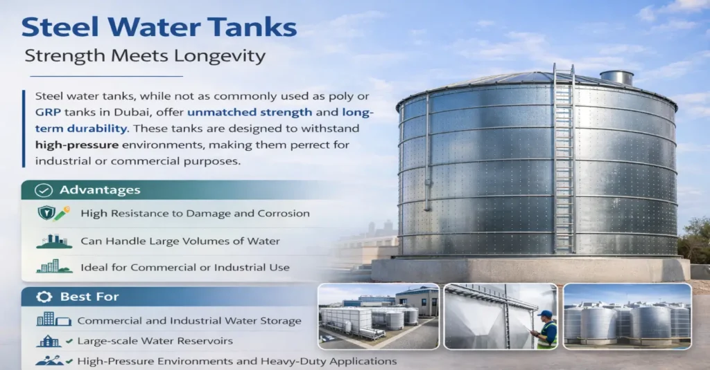 Although steel water tanks are not widely utilized yet in Dubai, compared to poly or GRP tanks, they are the most strong and durable. These tanks are made to last in high pressure environments and hence are ideal in industrial or commercial applications.