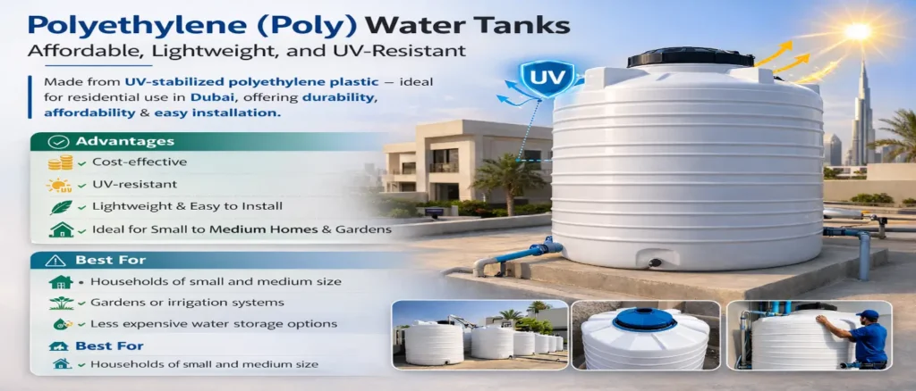 | Poly Water Tanks | AED 250 – AED 500 | 5-10 years | Low |
