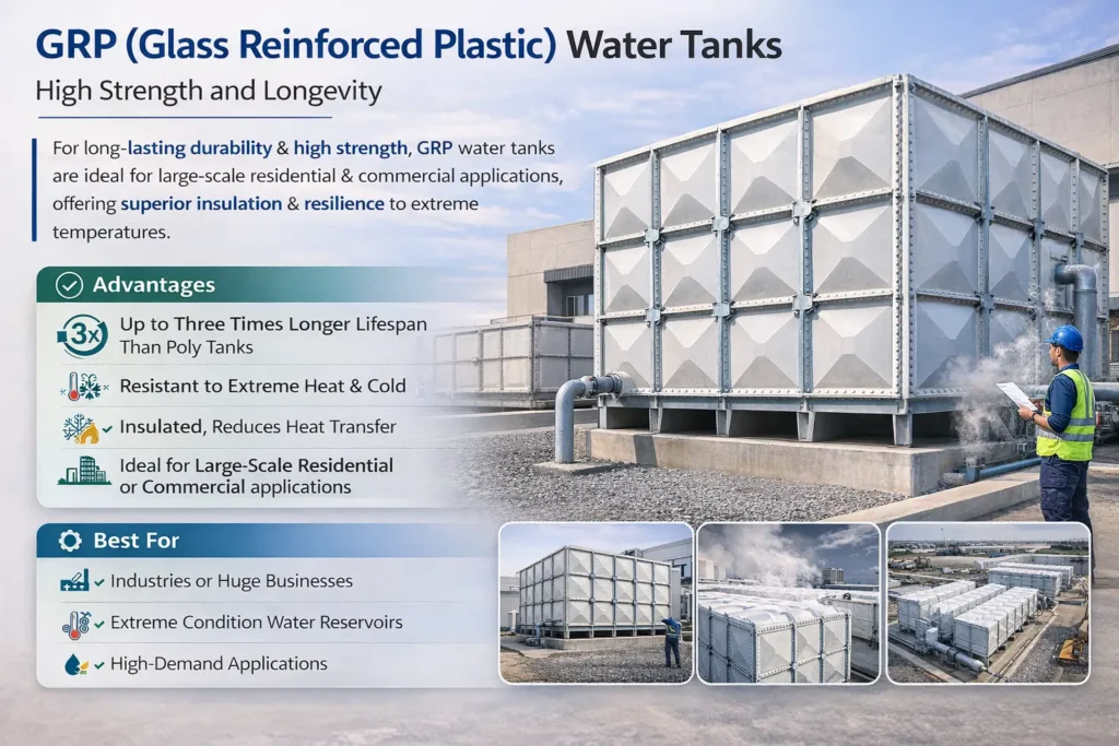 GRP (Glass Reinforced Plastic) Water Tanks: Longevity and High Strength.