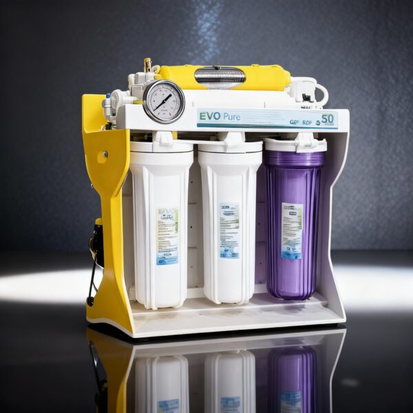 The EVO Pure 50 GPD RO System is a 5-stage reverse osmosis filtration system that provides 50 gallons per day of clean, filtered water. The system includes a sediment filter, carbon block filter, reverse osmosis membrane